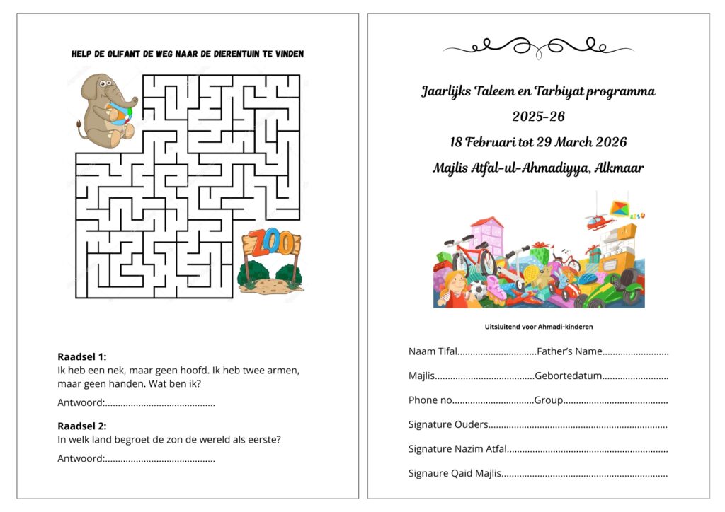 🚨 40-dagen Programma: Met succes is een gespecialiseerd 40-dagen Taleem & Tarbiyat programma voor Atfal-ul-Ahmadiyya gelanceerd. Dit programma is ontworpen om een gewoonte van regelmatig gebed, koranstudie en morele ontwikkeling aan te leren.
