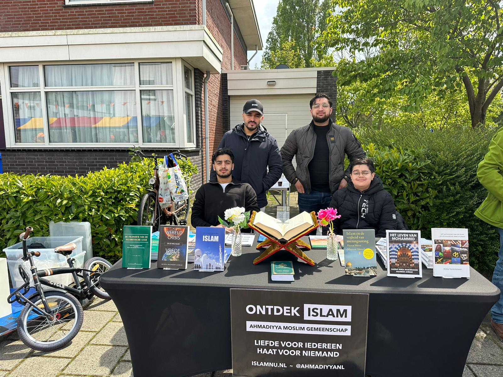 Op Koningsdag, die op 27 april plaats vond, heeft onze majlis 7 boekentafels op verschillende locaties georganiseerd, waarbij 12 Khuddam hebben deelgenomen. Tijdens deze activiteit werd er 1 Koran en 5 boeken verkocht via de boekentafels. Daarnaast werden er ook enkele vragen beantwoord van voorbijgangers waarbij de khuddams de introductie van de Djamaat hebben gegeven aan de geinteresseerden.