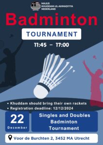 By Allah’s grace, we pray this message finds you well and dedicated to serving Majlis Khuddam-ul-Ahmadiyya. Agenda (Event Flow) Singles matches:https://challonge.com/wq56tc3y Double matches:https://challonge.com/en9czcw